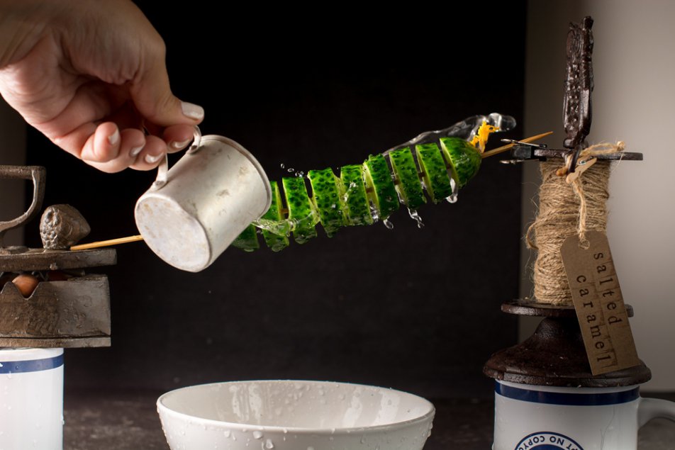 – Огурец аккуратно режется, нанизывается на шпажку, подвешивается с помощью определенных конструкций. Выставляешь свет, чтобы огурец был весь в фокусе, раздвигаешь кусочки, потом берешь лейку и начинаешь их поливать, при этом безудержно щелкая затвором фотоаппарата, делая до 500 дублей…