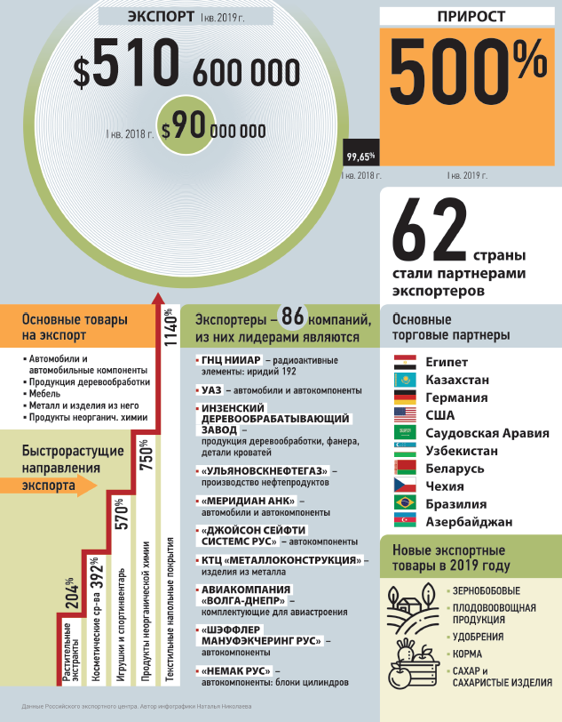 По данным Российского экспортного центра, в первом квартале 2019 года экспорт Ульяновской области составил $510,6 млн, прирост к первому кварталу 2018 года ($90 млн) – более 500%. 62 страны стали партнерами экспортеров Ульяновской области. Десять основных направлений – Египет, Казахстан, Германия, США, Саудовская Аравия, Узбекистан, Беларусь, Чехия, Бразилия, Азербайджан. Свою продукцию за границу поставили 86 ульяновских компаний. Основными экспортерами стали НИИАР, УАЗ, Инзенский ДОЗ, Ульяновскнефтегаз, «Меридиан АНК», «Джойсон Сейфти Системс Рус», КТЦ «Металлоконструкция», авиакомпания «Волга-Днепр», «Шэффлер Мануфэкчуринг Рус» и «Немак Рус».