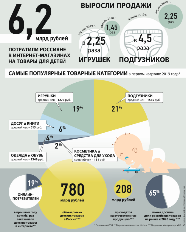 По данным АТОЛ, с апреля 2018 года по апрель 2019 год россияне потратили в интернет-магазинах 6,2 млрд рублей на товары для детей. Продажи игрушек при этом выросли в 2,9 раз, а продажи подгузников – в 4,5 раз.