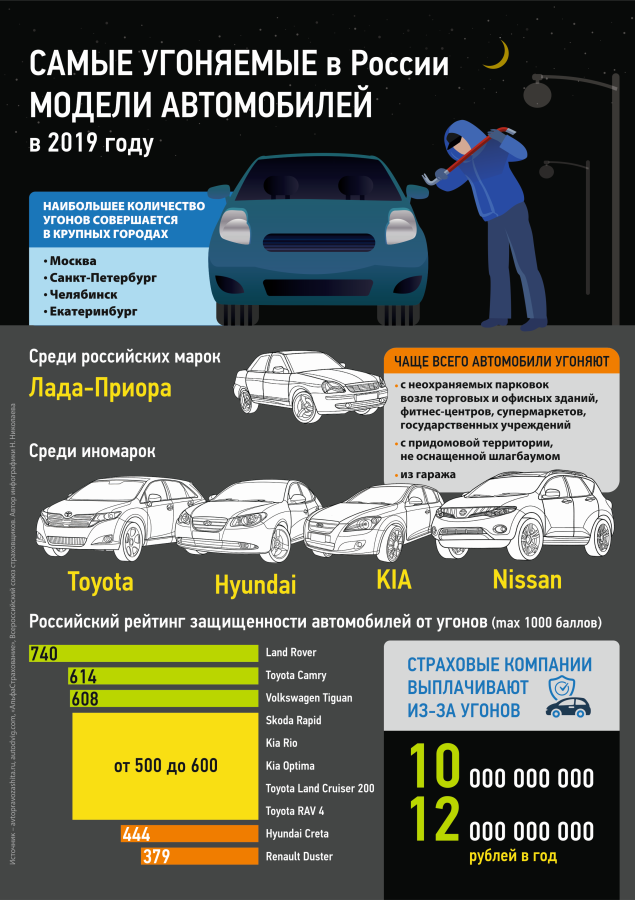 «Любимыми» автомобилями угонщиков в этом году стали Lada Priora, Toyota, Hyundai, KIA и Nissan. Наибольшее количество угонов совершается в Москве, Санкт-Петербурге, Челябинске и Екатеринбурге. Чаще всего автомобили угоняют с неохраняемых парковок возле торговых и офисных зданий, фитнес-центров, супермаркетов и государственных учреждений, с придомовой территории, не оснащенной шлагбаумом, и прямо из гаража. Источники этих данных – avtopravozashita.ru, autodvig.com, «АльфаСтрахование», Всероссийский союз страховщиков.