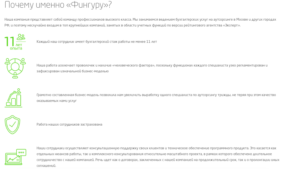Аутсорсинг бухгалтерских услуг – это оптимизация работы предприятия и залог успешного ведения бизнеса. Команда компетентных специалистов «Фингуру» всегда готова помочь вам уберечь фирму от штрафов и других проблем.