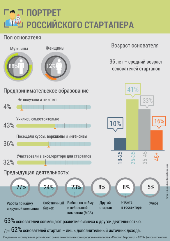 По данным исследования российского рынка технологического предпринимательства «Стартап Барометр – 2019», 88% основателей бизнеса в нашей стране – мужчины. Средний возраст стартапера – 36 лет. 43% основателей учились предпринимательству самостоятельно, 36% посещали курсы, воркшопы и интенсивы, еще примерно столько же (32%) участвовали в акселераторе для стартапов. И только 4% основателей не имеют предпринимательского образования и не хотят получить.