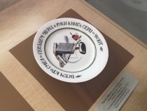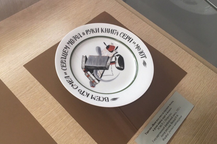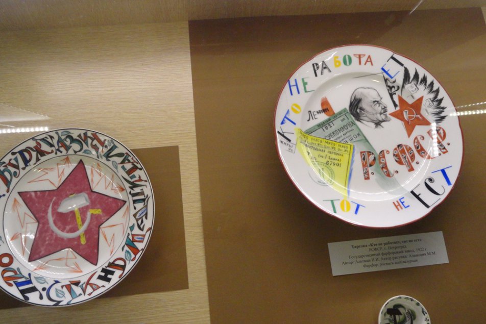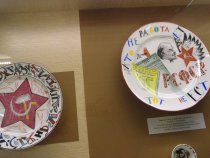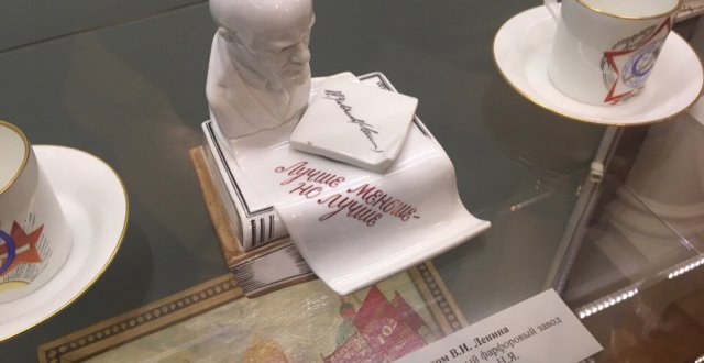 Среди экспонатов – чашка с портретом знаковой фигуры авиации и оборонного дела СССР летчика Г.Ф. Байдукова, тарелка «Кто не работает, тот не ест», ваза «20 лет Советской власти» и многое другое.