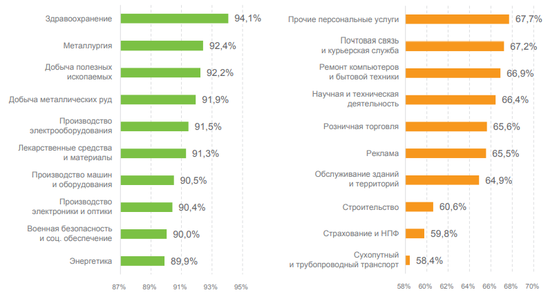 Наиболее стабильными оказались компании в области здравоохранения: по статистике, 94 из 100 продолжают работать на этом рынке более трех лет. Устойчивы также направления, где требуются значительные капитальные инвестиции, – металлургия, добывающая промышленность, энергетика.