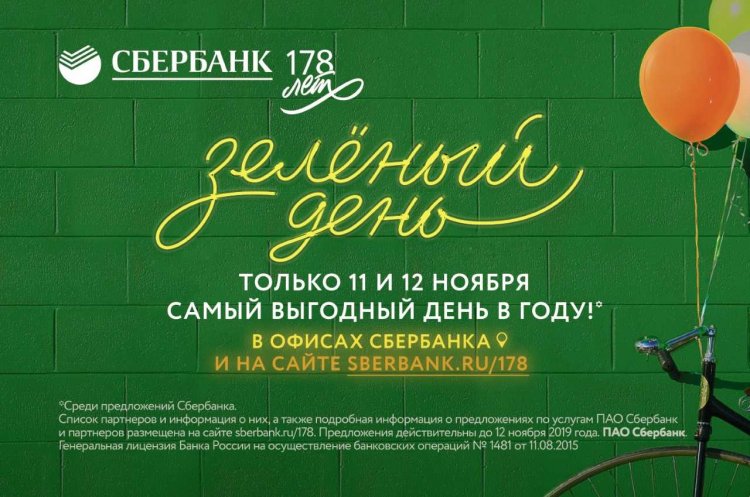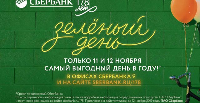 «Зеленый день» – это масштабное совместное промо свыше 150 компаний из различных отраслей, приуроченное ко дню рождения Сбербанка. В течение двух дней, 11 и 12 ноября 2019 года, организаторы и партнеры акции раздадут колоссальные скидки на свои товары и услуги. Для представителей бизнеса распродажа продлится дольше, до 17 ноября.