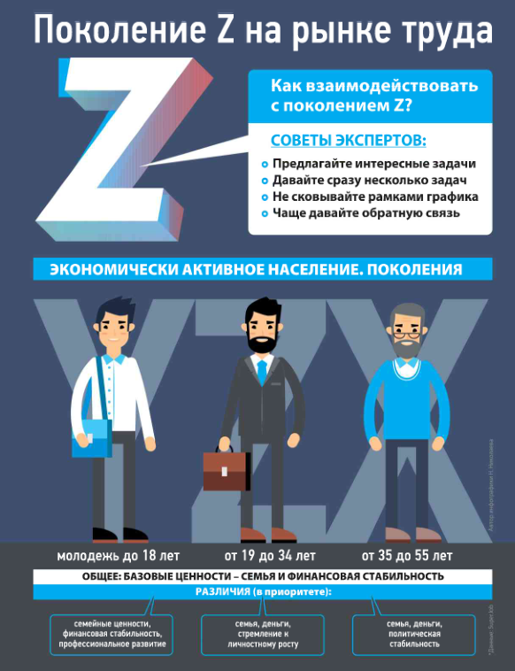 По данным исследования SuperJob, представителям поколения Z, то есть рожденным после 1995 года, нужно предлагать интересные задачи, причем лучше сразу несколько. Им важна обратная связь, а еще их нельзя сковывать рамками графика. Семья и финансовая стабильность – это базовые ценности поколения Z, которые объединяют их с двумя предыдущими поколениями, Y и X, объединяющими людей в возрасте до 55 лет. Но нынешние студенты и школьники больше заинтересованы в профессиональном развитии, тогда как люди Y активнее стремятся к личностному росту, а люди X ценят политическую стабильность.