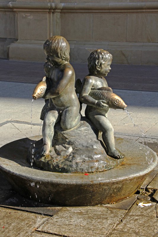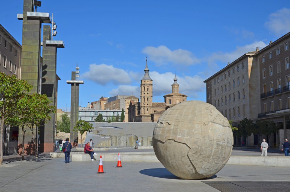 А на другой стороне площади, напротив Ла Сео, создана интересная композиция с фонтаном. Вода стекает по большой плоскости – по карте Испании – и падает в бассейн. Перед бассейном установлен Земной шар.