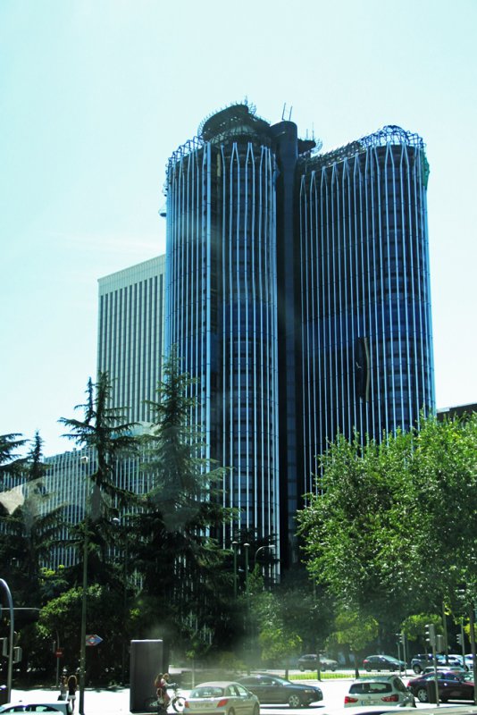 На другой площади, Пласа-де-Кастилья, в 1996 году возведены самые необычные здания Мадрида – «падающие» башни-близнецы. Два небоскреба наклонены друг к другу под углом 15 градусов. Называются они ТорресКИО (аббревиатура кувейтской фирмы Kuwait Investments Office), или «Ворота в Европу». Огромные бетонные противовесы в подвалах сооружений удерживают их в вертикальном положении, а мощные стальные балки, пущенные по фасадам, служат каркасом и придают стабильность.