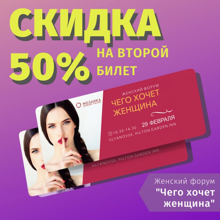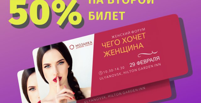 Купи два билета на главное событие этого года – форум «Чего хочет женщина» – и получи скидку 50% на второй билет.