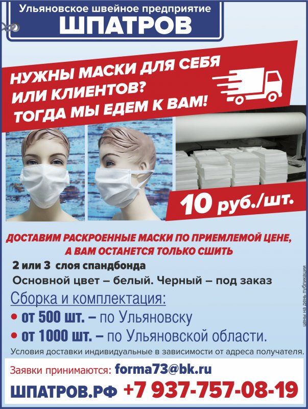10 рублей за экземпляр: ульяновская фабрика «ШПАТРОВ» перешла на крой многоразовых масок