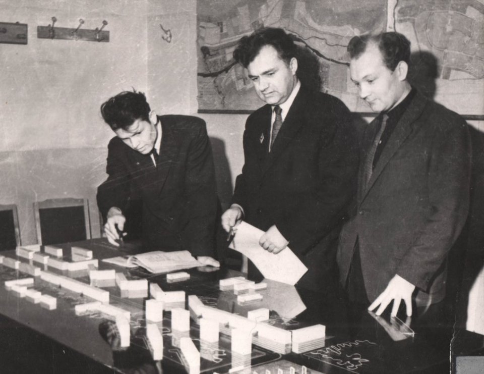 В.Н.Филимонов, Н.Н.Медведев, С.Н.Титов (слева направо) за обсуждением проекта застройки шоссе (проспекта) Нариманова. 1962 год.