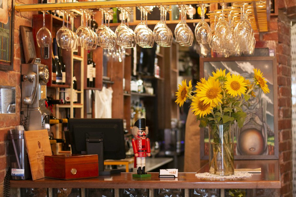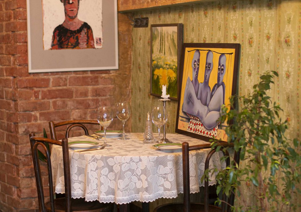 Основа нашего интерьера – картины. Они украшают зал. Мы ищем в интернете и на выставках подходящие работы современных молодых художников и регулярно дополняем коллекцию. Какие-то картины смешные, какие-то – на винную тематику, какие-то оригинальные. В Португалии на барахолке нашли набор оригинальных постеров, о которых узнали, что это вроде бы был фотопроект с европейскими знаменитостями, которые согласились, чтобы их внешний облик очень сильно модифицировали (на одном изображении можно, например, распознать Катрин Денев).