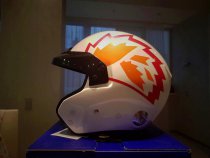 – Моя типография сотрудничает как с самим чемпионатом РФ по дрэг-рейсингу (RDRC), так и с отдельными командами и участниками. Ко мне обратился наш земляк Евгений Ильясов – пилот чемпионата. Для гоночного сезона он приобрел новую экипировку и попросил оформить свой шлем в соответствии с официальным стилем RDRC, который, к слову, был разработан студией Артемия Лебедева. Считаю, что мы успешно адаптировали стиль RDRC и нанесли его на сложную сферическую форму шлема. По крайней мере, пилот-заказчик остался очень доволен.
