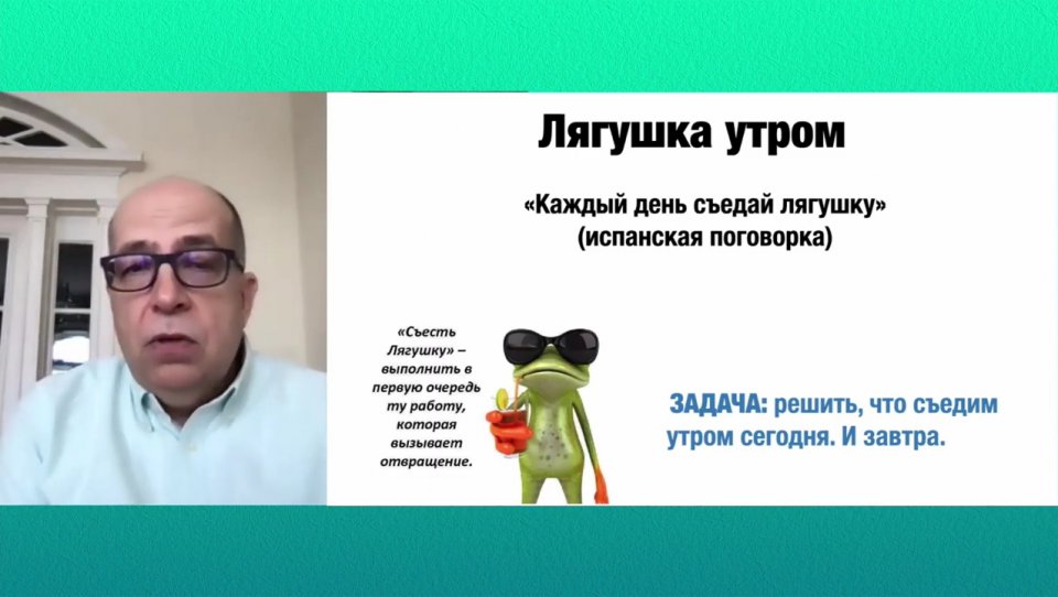 Биоритмы. Очень важно по утрам делать правильные вещи. Совет, который есть практически во всех книгах по личной эффективности: стараться по утрам «съедать лягушку», то есть справляться с какой-то самой неприятной задачей, которая у вас есть в списке дел. Сделано, – и ваша производительность пойдет по накатанной.