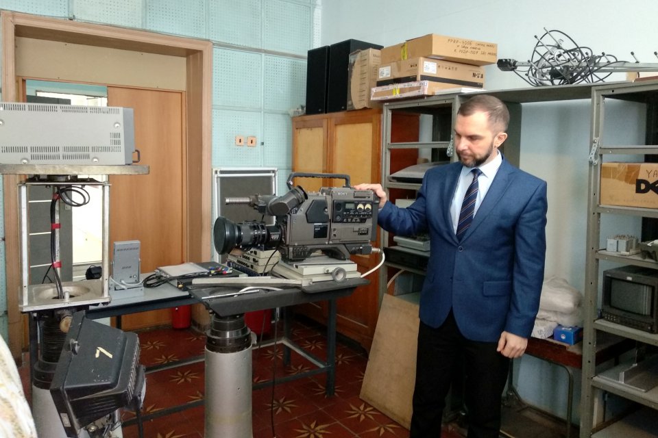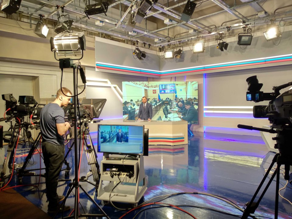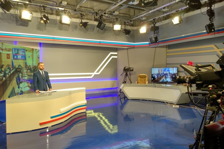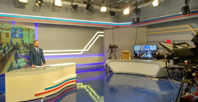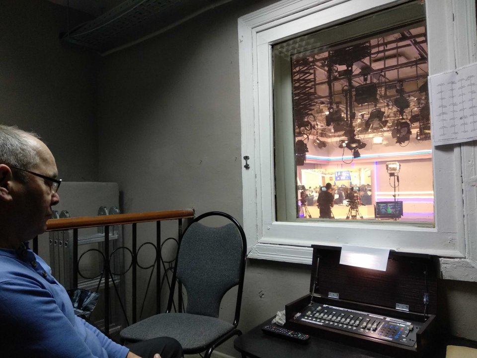 Запись итоговой программы недели с Сергеем Пузиковым, заместителем директора ульяновского филиала. Оператор управляет подачей света в кадр и следит за электричеством. Если здание обесточат, Виктор подключит резервные источники электропитания.
