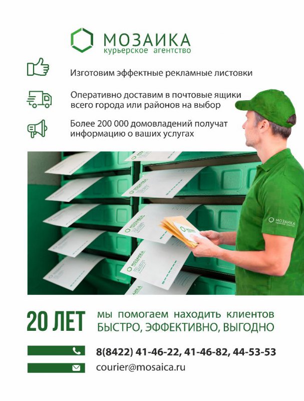 Курьерское агентство «Мозаика» предлагает услуги доставки рекламных материалов по почтовым ящикам. Это эффективная и надежная форма рекламы, информирующая горожан о товарах и услугах.