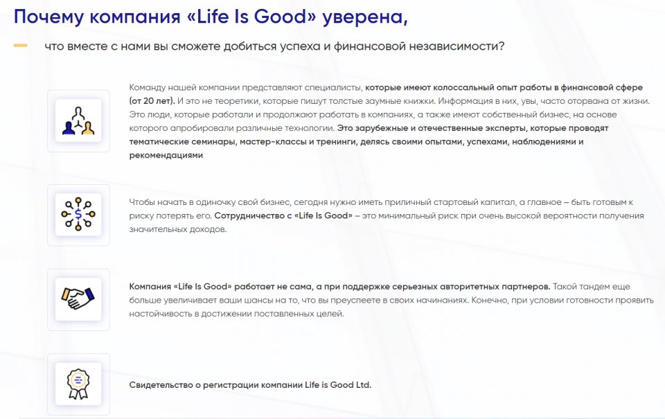 На сайте компании сообщается: «Если у вас уже есть сбережения, «Life Is Good» предложит самые надежные и безопасные финансовые инструменты, которые позволят сохранить и приумножить денежные активы. С «Life Is Good» у вас будет невероятная альтернатива банковской ипотеке. Приобрести недвижимость без выплаты огромных процентов, ежегодных страховых и прочих взносов можно по доступной и удобной программе взаимного финансирования. Партнерство с жилищным кооперативом «Бест Вей» открывает всем участникам сети «Life Is Good» доступ к самому дешевому и простому, а главное, проверенному временем способу покупки дорогостоящих вещей – кооперативу. Дополнительно компания дает возможность получать обучение в Международной Бизнес Академии IBA».