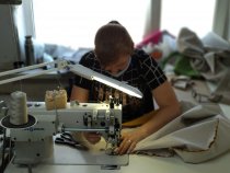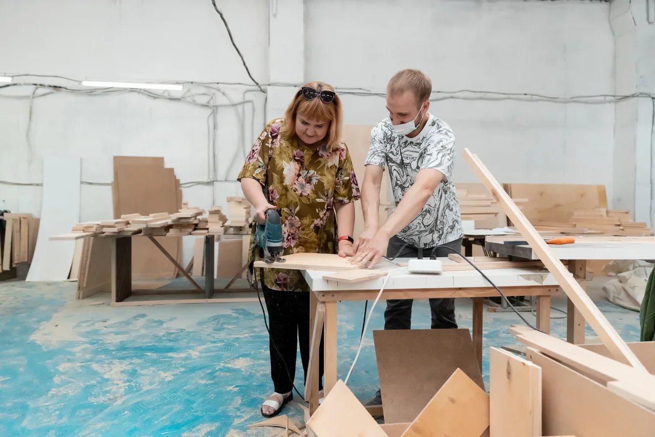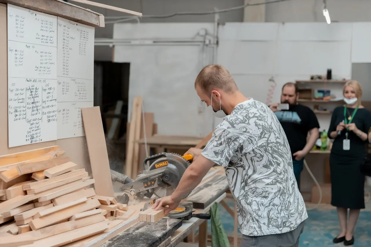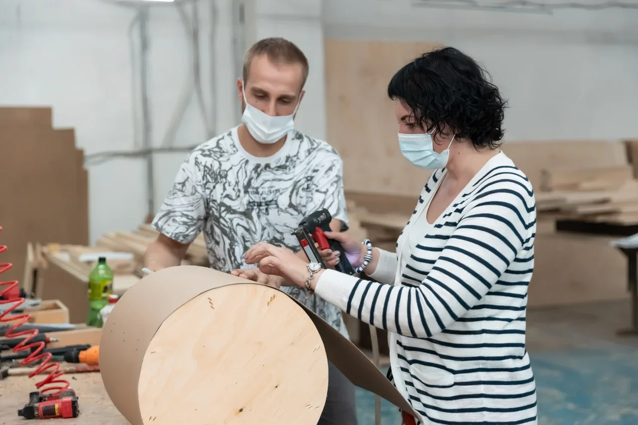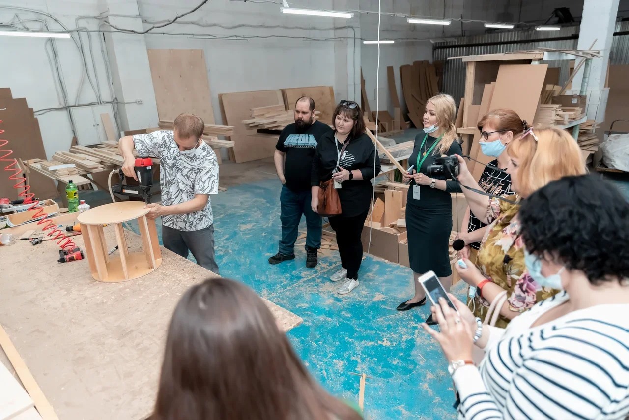 Вдохновленные рассказами молодых предпринимателей мы с коллегами не только воочию увидели «кухню» мебельного производства, но и решили самолично пройти все стадии производства. Под чутким руководством Ильи Чепоренкова всего за час был изготовлен пуфик. Подбадривая друг друга, мы выпиливали сиденья, пристреливали ножки мебельным степлером. Я вошла в азарт и потратила, наверное, дневную норму скрепок, обшивая каркас.