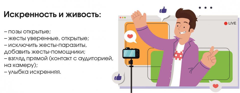Искренность и живость достигаются за счет поз и жестов. Хорошо иметь такого друга, который будет сидеть, смотреть за этим, а потом говорить, что было правильно, а что не так. Позы должны быть открытыми и уверенными.