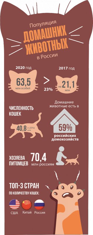 По данным Mars Petcare, популяция домашних животных в России выросла на 23% с 2017 года, или на 12,1 млн особей. Сегодня она достигает 63,5 млн домашних собак и кошек, живущих в российских семьях. Темпы роста ускорились по сравнению с предыдущим трехлетним периодом, когда увеличение составило 14%. Численность кошек в 2020 году составила 40,8 млн (+25%).