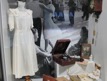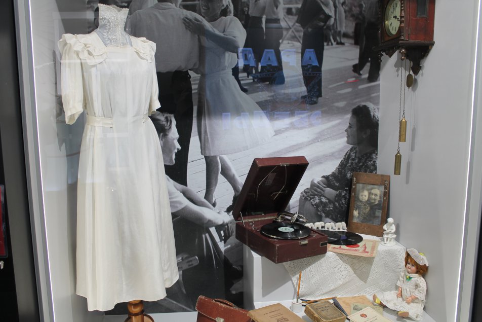 На стенде, символизирующем мирную жизнь в Советском Союзе, представлено выпускное платье из парашютного шелка 40-х годов. В то время было очень трудно достать нормальную ткань, и обычно вечерние наряды шили из тюля. Получается, что мать школьницы постаралось, выполнив уникальное платье ручной работы из парашютного шелка, чтобы дочка выглядела прекрасно на выпускном вечере.