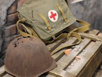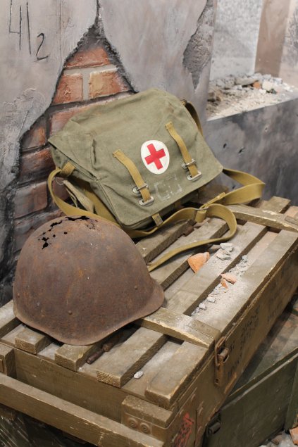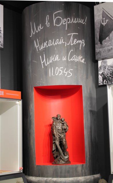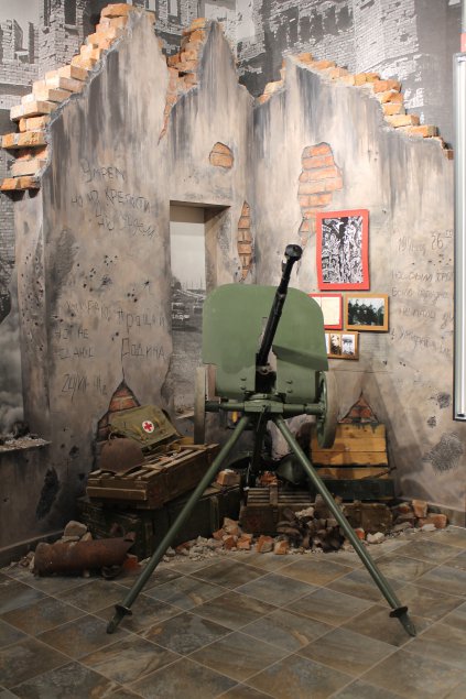В инсталляции, посвященной Брестской крепости, представлены подлинные кирпичи из Бреста, гильзы, снаряды, осколки, каски, а также фотографии наших земляков, проявивших себя в обороне.