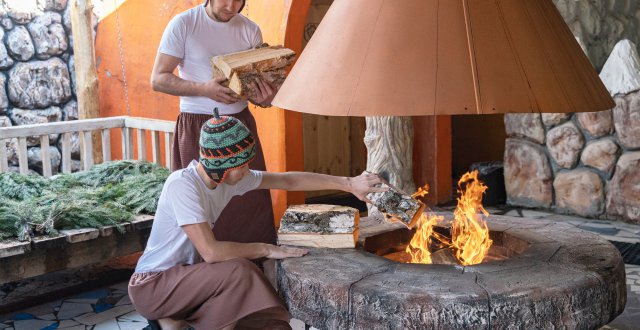 Жена варит гостям домашние щи, а муж жарит умопомрачительную рыбу в тандыре. Он сам проектирует витиеватый дизайн помещений, создает сказочный декор, лепит столы, лавки, камины (гены дедушки-художника!), она заваривает напитки для чайной церемонии, подбирает полезные закуски, заказывает у деревенской мастерицы яркие банные шапочки, которые идут всем.
