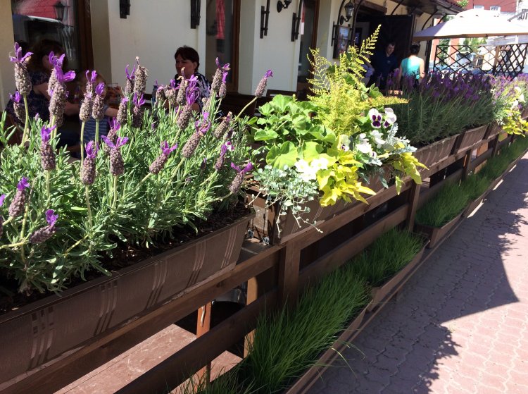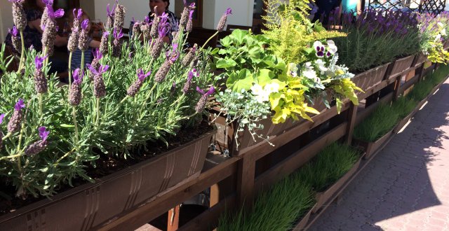Каждый год с наступлением теплых деньков открытая площадка ресторана буквально расцветает, и концепт флористического оформления не повторяется ни разу! Этим летом акцент сделан на контрастность цветовой гаммы ипомеи, дихондры, калибрахоа, а солирует в этом великолепии любимица публики – лаванда. Отличная работа профессионалов из Студии озеленения Green Box!