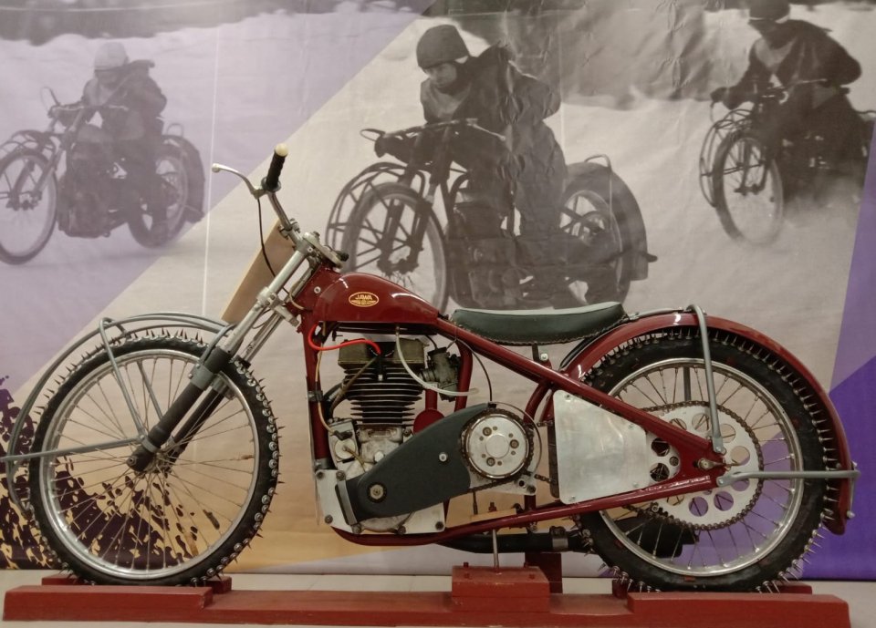 Мотоцикл предназначен для гонок по льду, поэтому его резина оснащена длинными и острыми металлическими шипами. Так как гонки проводятся по стадиону, залитому льдом, против часовой стрелки, на переднем колесе большее количество шипов сконцентрировано именно слева. Двигатель одноцилиндровый, четырехтактный, двухклапанный мощностью 55 л.с. и работает на метаноле. Двигатель в этом мотоцикле в холодную погоду запускается плохо, поэтому гонщики перед стартом прогревали их паяльной лампой.