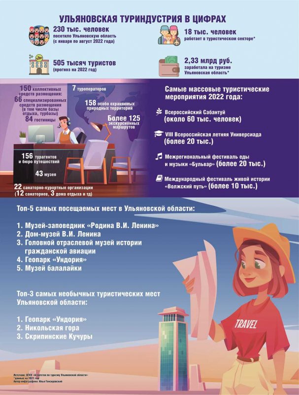 Стоит отметить, что в 2021 году Ульяновскую область посетило с учетом экскурсантов более 495 тысяч человек, что на 126% превысило аналогичный показатель 2020 года, когда из-за пандемии и введения ограничительных мер туристический поток значительно сократился.
