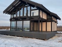 Новый дом стал средоточием самых актуальных трендов строительства. Экологически чистые деревянные стены, полы и перекрытия дополняются панорамными окнами: стекло не подвержено влиянию температуры, благодаря чему даже зимой жителям будет комфортно находиться внутри.