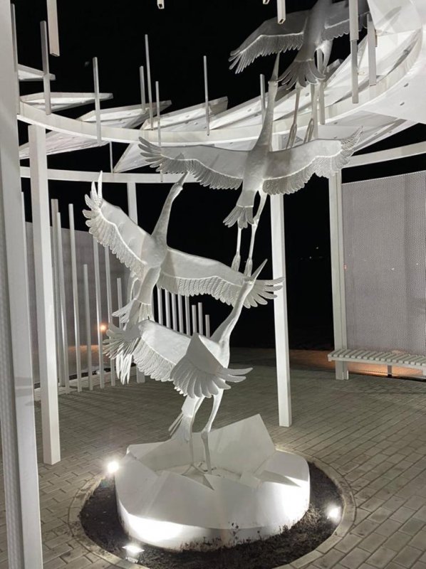 А еще сквер уникален тем, что дорожки здесь в форме восьмерки – символа бесконечности, и как бы ты ни шел, то непременно проходишь через Журавлиную ротонду, – так мы назвали эту воздушную конструкцию, здесь можно посидеть, посмотреть, как белые журавли взмывают в небо. Днем перфорированную металлическую перголу пронизывают солнечные лучи, но по-особенному в сквере красиво в темное время суток – благодаря специальному освещению.
