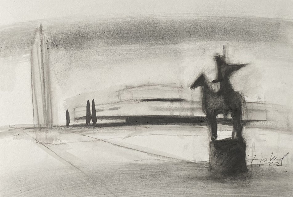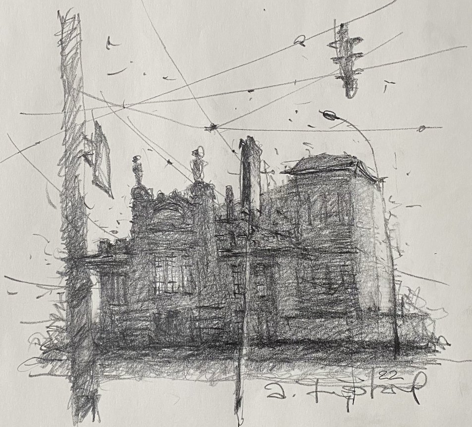 В этом цикле несколько групп рисунков. Одни отличаются размером и символизмом, другие - техникой рисования. Год назад в моих прогулках по городу самым мощным впечатлением стал Ленинский Мемориал. Мы все его видели в учебниках по архитектуре. Но только вблизи ты осознаешь всю мощь и силу этого грандиозного сооружения. Нарисовать его в той же манере, что чудесную улицу Гончарова, когда карандаш танцует и рисует балясинки, не получится. Приходилось изобретать новые способы изображения, искать то, что заинтригует зрителя.