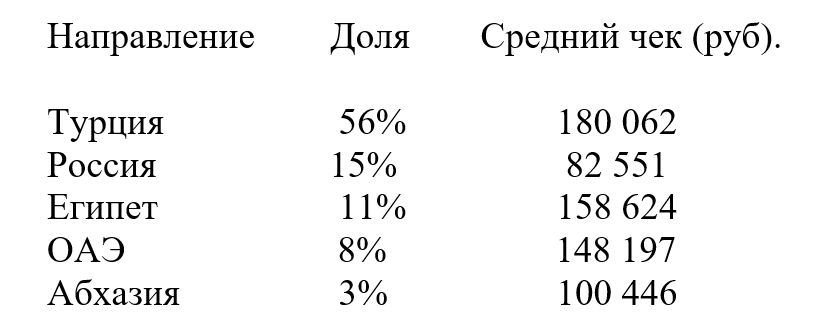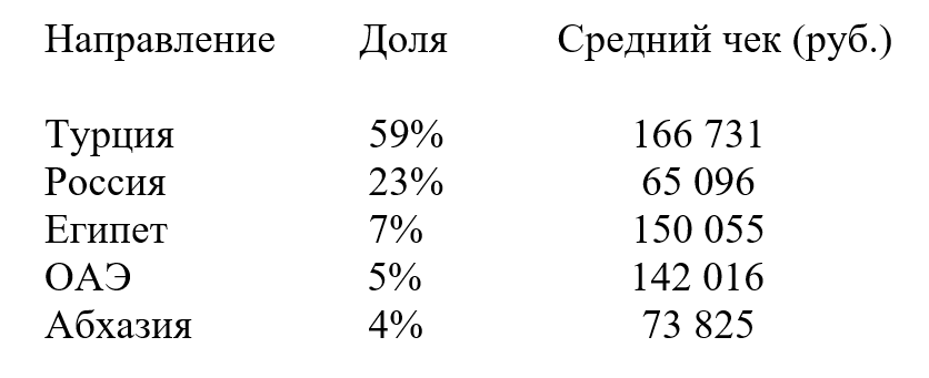ТОП-5 самых популярных туристических направлений у Абхазии, но и она немного потеряла: ее доля составила 3%, прошлым летом было на процент больше. Средний чек увеличился с 74 до 100 тыс. руб.
