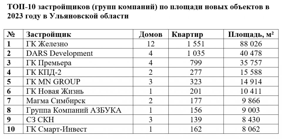 Среди идентифицированных застройщиков (групп компаний) больше всего новых объектов на рынок региона вывели ГК Железно (12 объектов), а также DARS Development, ГК Премьера и СК СТРОЙСИТИ ОРЕНБУРГ (по 4 объекта). По площади новых объектов лидируют ГК Железно (88,03 тыс. м²), DARS Development (40,48 тыс. м²) и ГК Премьера (35,76 тыс. м²).