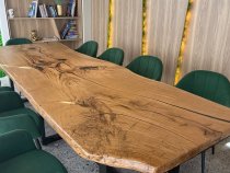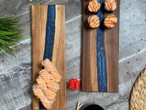 - Один из первых был и самым необычным – приставной столик с магнитами. Нам по почте прислали много интересных (по определенной тематике) магнитов, и мы их залили на разных уровнях в стол. Получилась необычная объемная форма. Один раз получили заказ на нашу авторскую рогатую разделочную доску, только огромного размера!