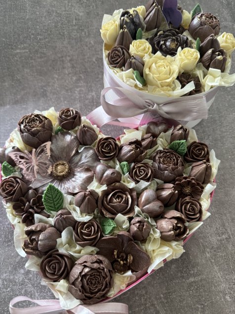 Эффектные букеты из трех видов шоколада в шляпной коробке - отличный подарок учителю к последнему звонку или просто как комплимент близкому человеку. А коробку оригинальных авторских конфет не стыдно подарить и губернатору.