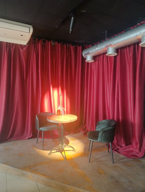 Интересный факт: руку к созданию интерьера нового listening-бара приложили… нет, не профессиональные дизайнеры, а сами рестораторы, создатели уникального проекта. Они, например, придумали установить в заведении мини-сцены, а также красные портьеры, на которых по-театральному играют лучи света. Сюда прямо-таки просится какой-нибудь исполнитель, например, в жанре стандапа. Авторы проекта обещают – «живые» выступления в «Фонотеке» будут!