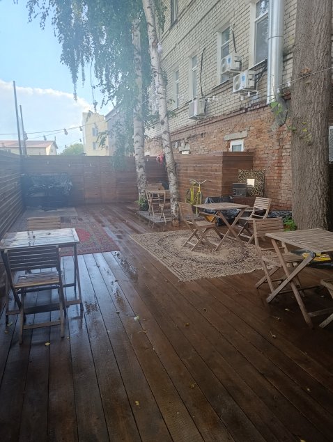 Отмечу, что у летника «Фонотеки», претендующего на самую оригинальную в городе открытую террасу, есть интересная особенность - навес, точнее его отсутствие. Что ж, будем надеяться, что внезапный ливень не испортит настроение публики, отдыхающей в «питерском» дворике под открытым небом.