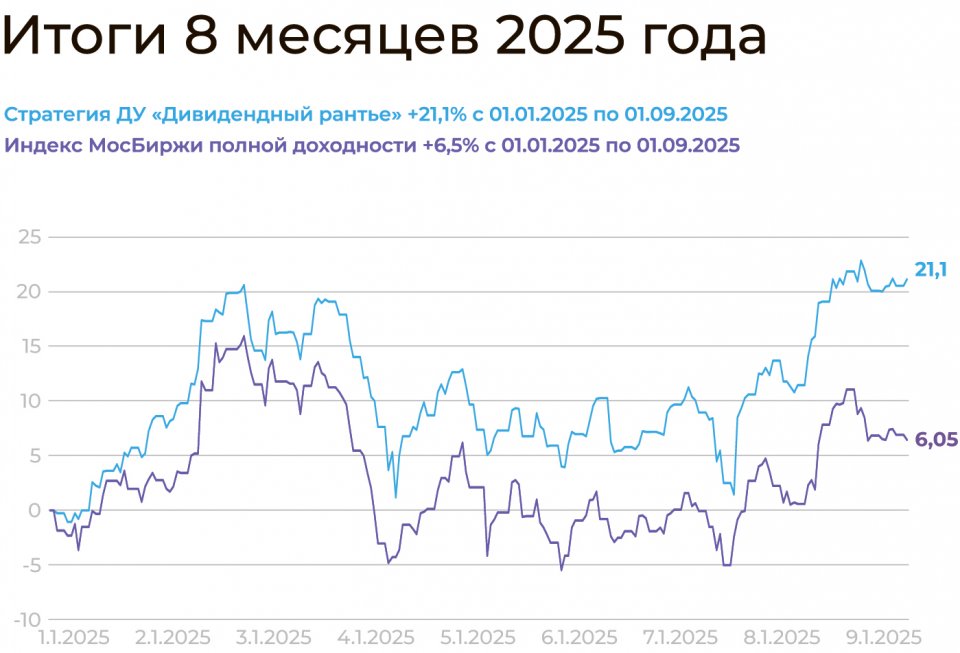 Сегодня это разумный выбор для тех, кто хочет сохранить и приумножить свои средства. Например, флагманская стратегия «Дивидендный рантье» от СОЛИД Брокер показала доходность +31,7% годовых за первые 8 месяцев 2025 года. «Дивидендный рантье» несколько лет подряд показывает доходность на уровне топ-5 среди всех российских ПИФов в акции.