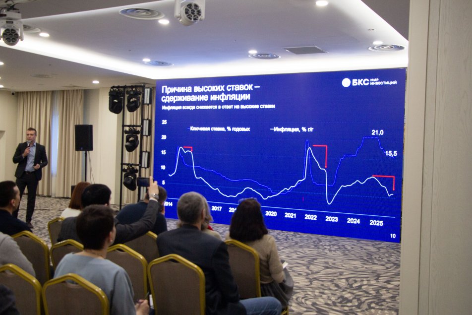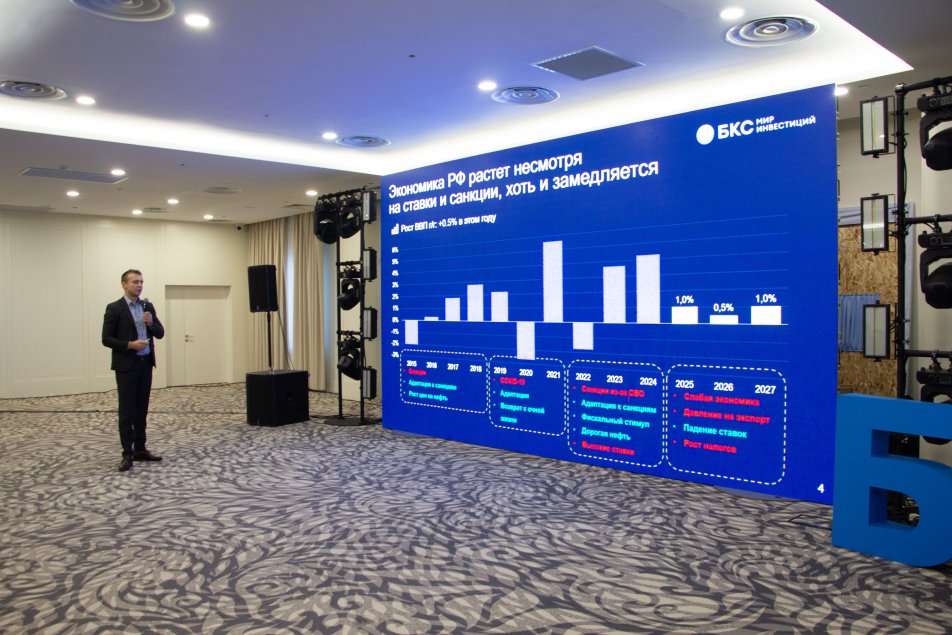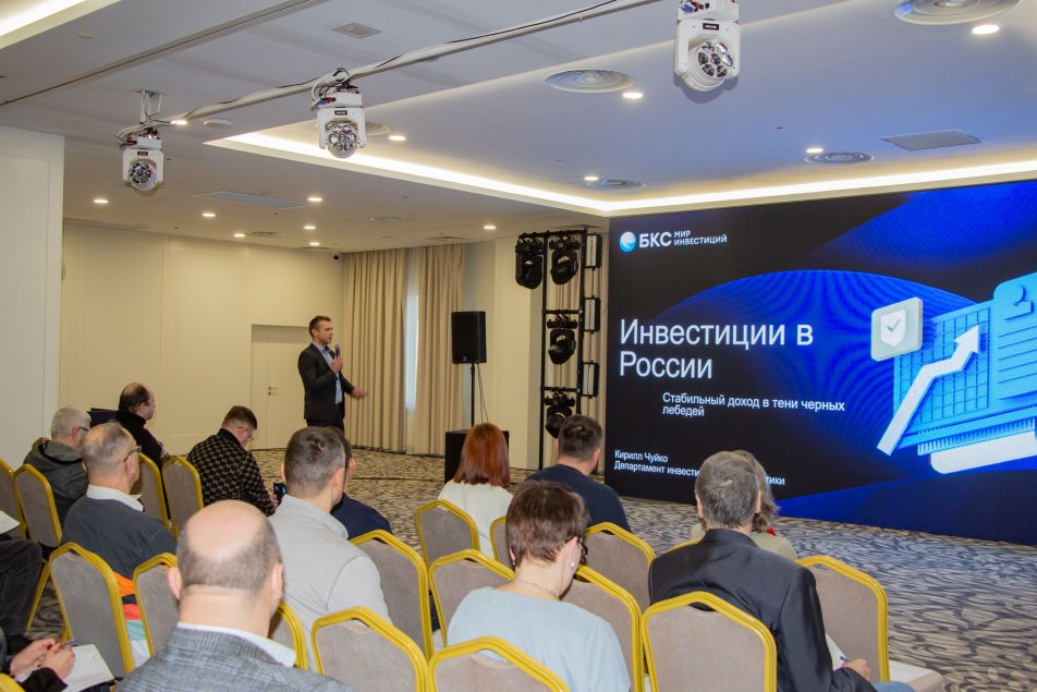 19 февраля в ульяновском «Кошелев Конгресс-холле» прошла конференция «Инвестиции в России: стабильный доход в тени черных лебедей». Организатором выступил холдинг «БКС Мир инвестиций». Мероприятие собрало тех, кто хочет разобраться в текущей экономической ситуации и найти работающие стратегии для сохранения и приумножения капитала. Главный спикер — Кирилл Чуйко, директор по инвестиционной аналитике БКС (Москва). Вместе с ним на вопросы гостей отвечал Роман Старцев, директор по развитию Fintarget.