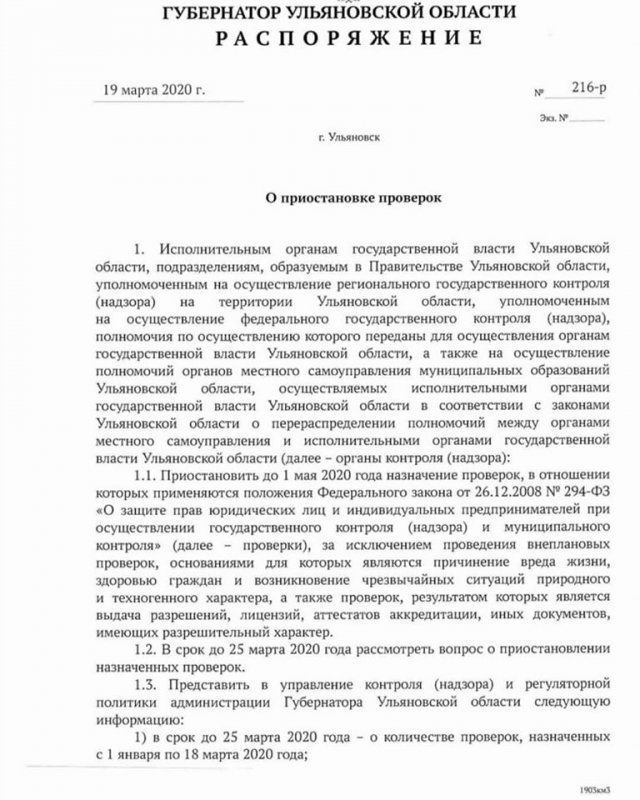 По документу, проверки предприятий органами контроля и надзора в Ульяновской области отменяются до 1 мая 2020 года.