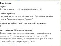 Предприятия сообщили об отсутствии денег на зарплату, аренду, погашение кредитов и выплату налогов, критическом падении спроса и – как итог – закрытии на период «каникул». Они рассказали, сколько сотрудников у них сегодня находятся под угрозой сокращения, и поделились своим мнением о том, какие действия государства действительно улучшили бы бизнес-климат. Это отмена кредитных платежей и налоговых отчислений, начисление зарплаты за нерабочие дни государством, а не работодателем, прямая материальная помощь бизнесу.