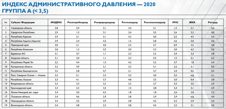 Самый низкий индекс административного давления отмечен в Ульяновской области – 2,8. Самый высокий – в Кабардино-Балкарии, 4,5.