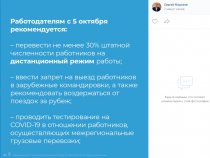 Также бизнесу рекомендовано отказаться от зарубежных командировок и тестировать на COVID-19 сотрудников, которые осуществляют межрегиональные грузовые перевозки.