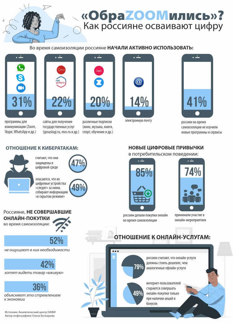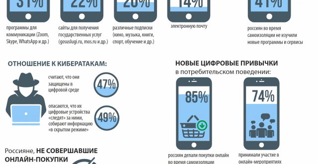 По данным аналитического центра НАФИ, во время самоизоляции россияне начали активно использовать программы для коммуникации, сайты для получения государственных услуг, различные подписки и электронную почту. 85% жителей страны делали покупки через интернет, 74% принимали участие в онлайн-мероприятиях.