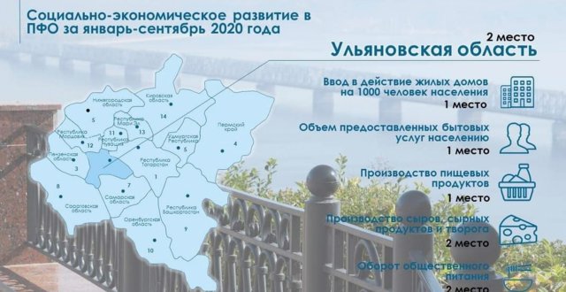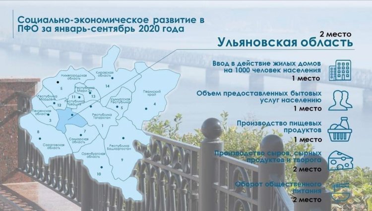 «По итогам девяти месяцев Ульяновская область занимает второе место в рейтинге регионов Приволжского Федерального округа по показателям социально-экономического развития. Хорошие значения показателей продемонстрировали строительная отрасль, потребительский рынок, пищевое производство», – заявил председатель правительства Ульяновской области Александр Смекалин.