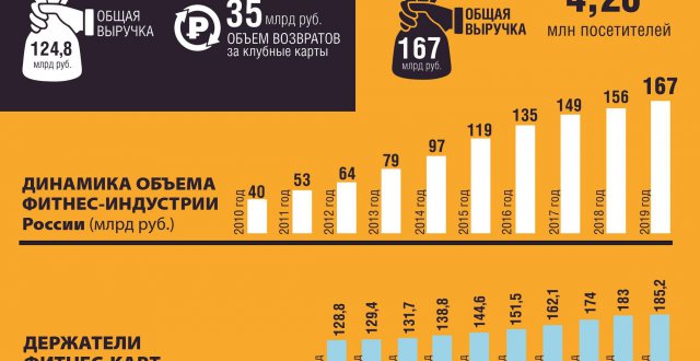 Эксперты подсчитали: общая выручка фитнес-центров в России по итогам 2020 года может составить 124,8 млрд рублей. Объем возвратов за клубные карты в этом году оценивается в 35 млрд рублей. По оценкам, из-за пандемии отрасль потеряет более 40 млрд рублей.