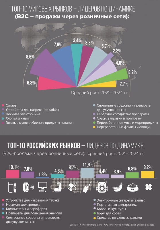 ГК «Институт тренинга – АРБ ПРО» представила топ-10 мировых и российских рынков в сферах производства, услуг и b2b-продаж по прогнозной оценке роста в 2021-2024 годах.
