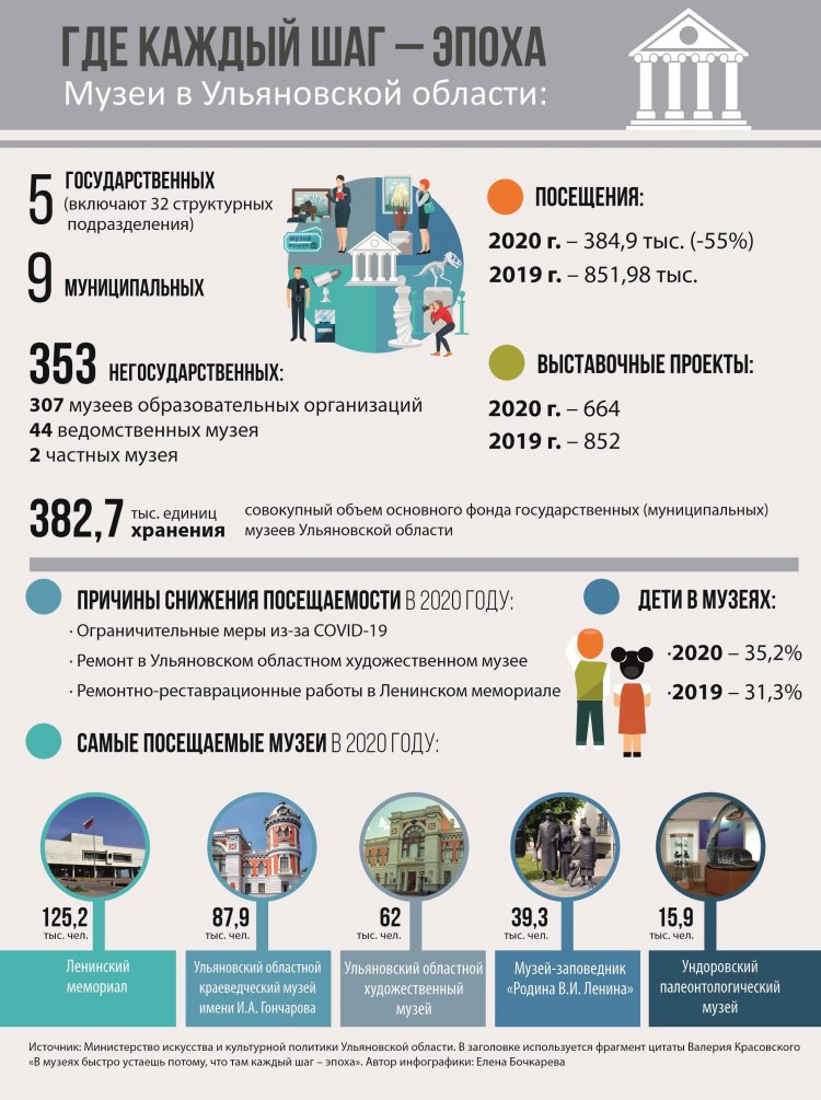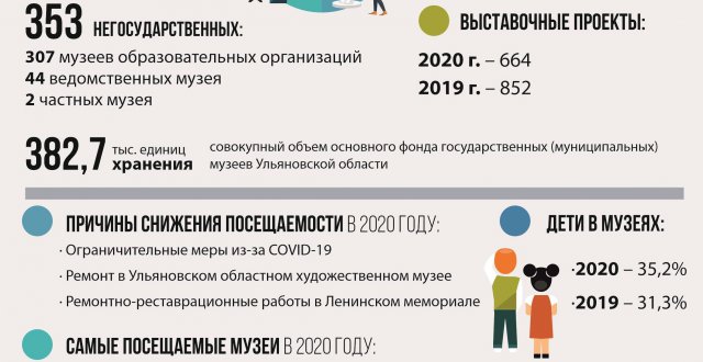 По данным Министерства искусства и культурной политики Ульяновской области, в регионе 5 государственных музея (включают 32 структурных подразделения), 9 муниципальных и 353 негосударственных музея. Совокупный объем основного фонда государственных (муниципальных) музеев Ульяновской области составляет 382,7 тыс. единиц хранения. В 2020 году количество посещений региональных музеев снизилось на 55%. В министерстве это связывают с ограничительными мерами из-за COVID-19, а также ремонтом в Ульяновском областном художественном музее и ремонтно-реставрационными работами в Ленинском мемориале.
